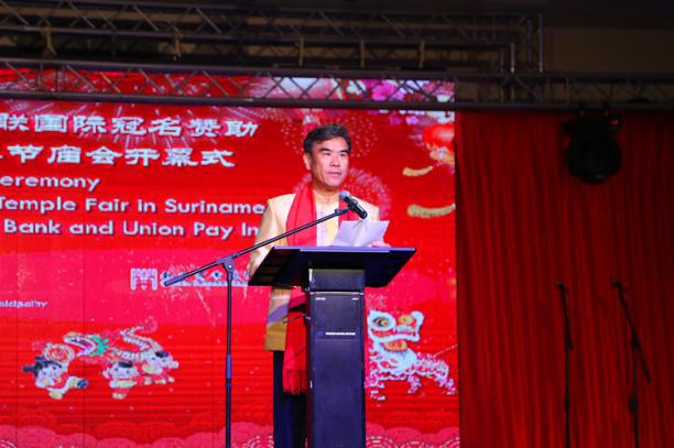 【使馆讯】阳和启蛰,品物皆春。2月16日,由驻苏里南使馆与苏里南华侨华人联合总会共同举办的农历戊戌狗年春节庙会开幕式在首都帕拉马里博工商联合会展览中心盛大开幕。苏里南总统鲍特瑟夫妇、驻苏里南大使张晋雄夫妇,苏副总统夫人、外长、财长、土地森林部长、央行行长、国家安全局长、警察总监、首都各大区区长及国会议员、驻苏使节和国际组织驻苏代表、苏社会各界名流,苏华总会会长张志和、各侨团代表、孔子学院老师,北京市侨办代表团等近三千人参加活动。