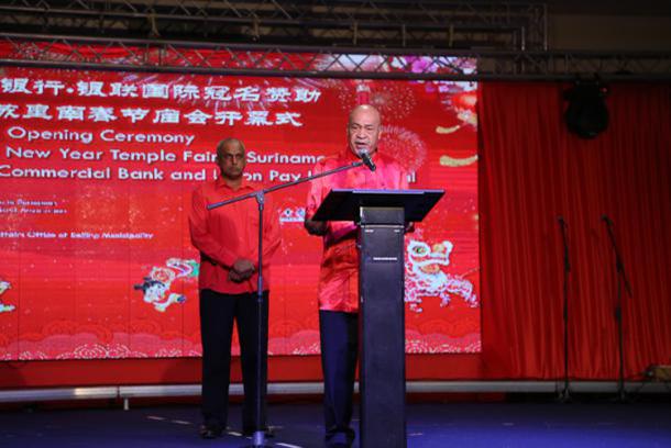 驻苏里南大使张晋雄与苏里南总统鲍特瑟出席第四届苏里南春节庙会开幕式