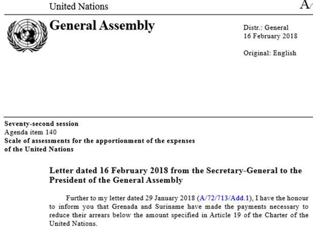 据之前的消息,苏里南所拖欠的会员费达到80万美元之多。虽然政府现在已经支付了部分拖欠的会员费,但是政府并没有透露他们究竟支付了多少欠费。根据联合国公约第19条表示,如果成员国拖欠会员费超过两年时间以上,那么组织将会根据规定暂时剥夺投票权。