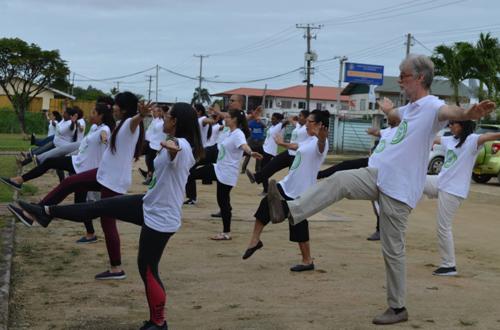 大使致辞后,是丰富多彩的文艺活动。首个节目,由马自奋老师带领60位学员表演的太极拳吸引了来宾的注意力,尽管学员们的一招一式还不是很熟练,但从他们的认真和专注看出其对太极拳文化的认同,表演完毕,全场欢呼;接下来的是苏里南文化艺术中心演员们带来的扇子舞,动作优美、身姿曼妙,给大家带来了许多欢乐;而来自河北省医疗气功医院的肖远德老师指导大家一起互动的内养功练习把活动推向了高潮,大家、练习通过学习吸气、运气、屏气等并与肢体活动结合,达到强身健体的作用。刘哲老师组织学员演唱了在几曲清丽、婉转、舒缓的《茉莉花》、《月亮代表我的心等中文歌曲,优美的旋律、欢快的乐声,唱得大家兴高采烈、热情绽放。活动最后,孔院领导与教师向刚刚结业的二期学生一一颁发证书并与其合影,手捧这用勤奋与智慧换取的证书,学员们感概万分,纷纷表示要再激再励努力学习,再创佳绩。
