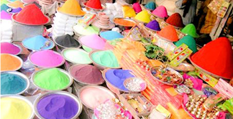 洒红节所使用的彩色粉有着各种的颜色,这包括红色、绿色、蓝色、黄色、紫色和橙色,至于较为常用的是婴儿爽身粉。