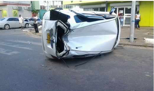 由于受到猛烈撞击,从路口转出的汽车被撞翻。
