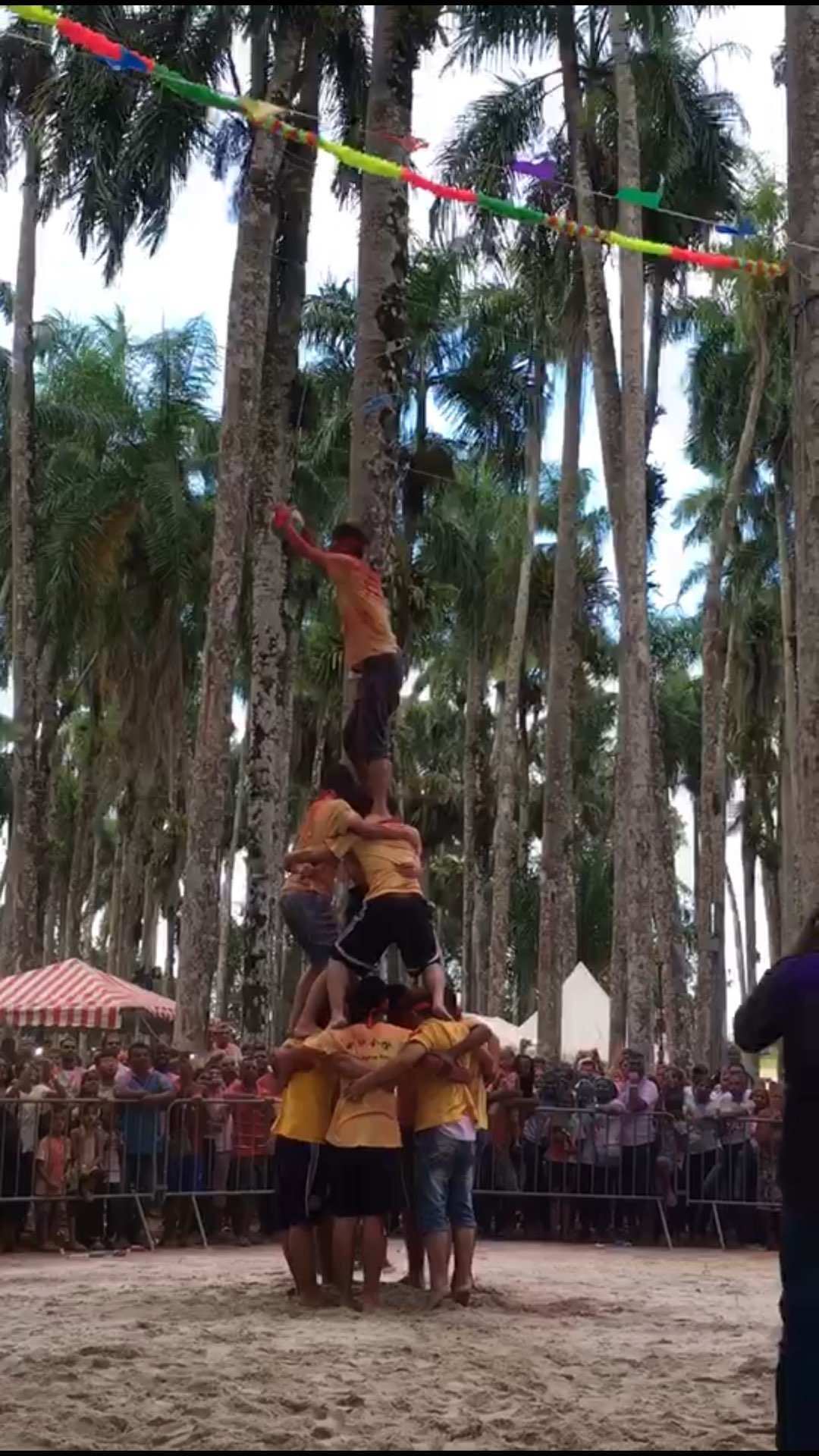 “抢彩头”比赛就是通过叠人塔的方式夺取高挂的悬浮煲,此活动一直都受到民众的欢迎。
