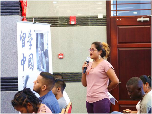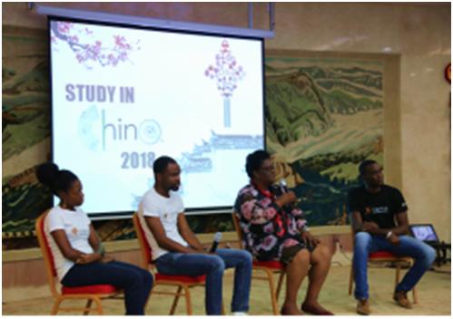 使馆工作人员李冠男和卡尤发代局长分别介绍了中国高等教育情况及中国政府奖学金申请程序和注意事项。留华同学会理事布罗姆分享了留学经历以及克服文化差异、更好适应留学生活的体会。