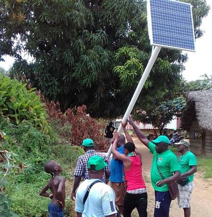 [GFC新闻网讯]NPS党主席Gregory Rusland在去年12月份前往苏里南河上游地区进行访问的时候就已经承诺过会解决村庄的电力供应问题。现在Rusland主席的承诺已经随着NPS党在New Aurora村设置太阳能电池板而获得兑现。