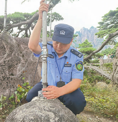每天早上7点,胡晓春便开始了巡护观测工作。监测松树枝丫、松针和树皮的细微变化,检查支撑架、拉索、防雷设施情况……“白天每隔两小时进行一次例行检查,如遇雷暴等天气,每半个小时就要巡查一次。夜间则启动红外线防侵入报警系统,随时随地查看迎客松情况。”胡晓春说。