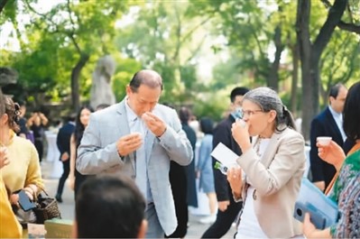 驻华外交官在北京举办的“茶和天下”·雅集启动仪式上品茶。