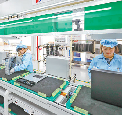 工人在毕节一家计算机生产企业产线上组装产品。