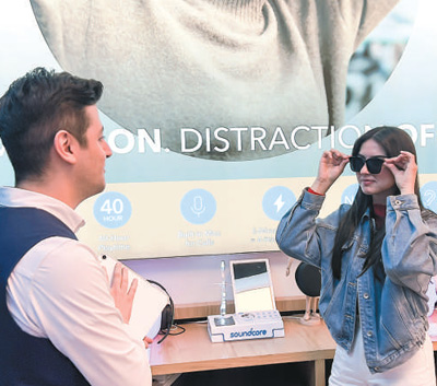 消费者在体验安克创新带有骨传导耳机功能的墨镜产品。