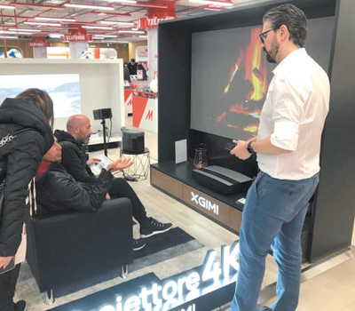消费者在极米科技位于意大利米兰一家电器商场的快闪店体验投影仪产品。