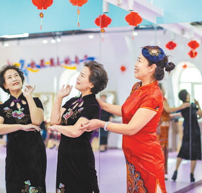 内蒙古自治区呼和浩特市玉泉区老年大学学员在练习模特造型。
