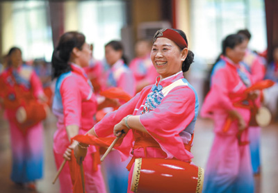 近年来,江西省吉安市吉水县组织音乐舞蹈、中医养生、营养烹饪等老年人喜闻乐见的活动,丰富老年人的生活。图为当地的老年人正在开心地打腰鼓。