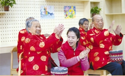 福建省南安市金淘镇敬老院内,志愿者在教老人学习手鼓。