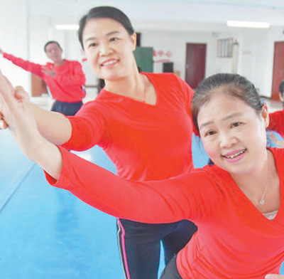 湖南省永州市江永县文化馆,永新社区的老人在学习舞蹈动作。