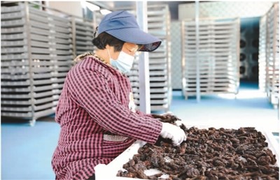 莱芜区茶业口镇阁老村中草药加工车间,工人对地黄进行分拣、烘干。