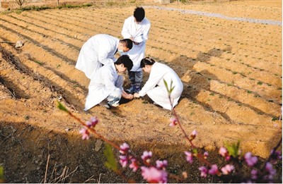 莱芜职业技术学院师生在莱芜区苗山镇田家楼村的白花丹参种植基地查看种苗情况。