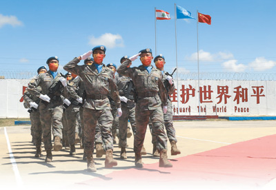 中国第二十批赴黎巴嫩维和部队官兵在驻地进行队列展示。