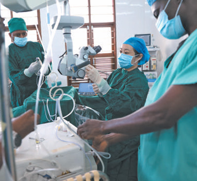 第三十二期中国援坦桑尼亚桑给巴尔医疗队的眼科医生与当地医生一起做术前准备。