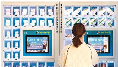日前,莘莘缘校园新零售平台在内蒙古商贸职业学院投入使用。图为一名学生在该零售平台配送柜前收取订购的货品。