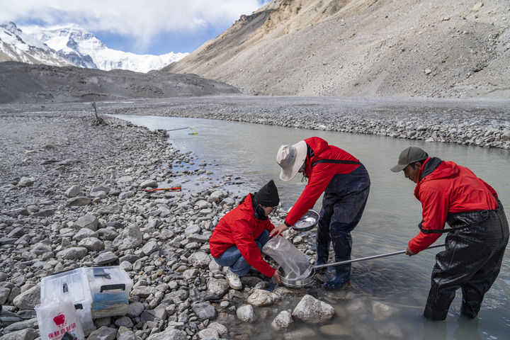 在珠峰脚下的绒布河畔,科考人员在采集水生生物样本(5月22日摄)。新华社记者 孙非 摄