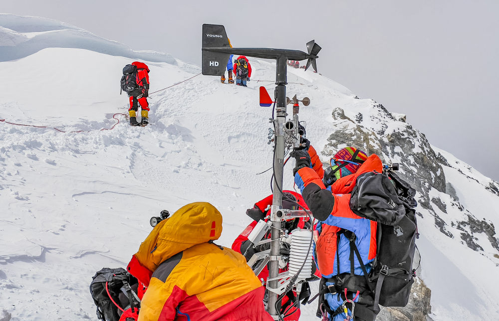 当日凌晨3时,科考队员从海拔8300米的突击营地出发,历经数小时攀登,终于抵达海拔8830米的世界最高自动气象观测站。固定钢筋绳索,更换蓄电池,安装风速风向传感器……经过约1小时的紧张工作,气象站零部件升级工作全部完成。随后,他们攀登至8848.86米的峰顶,利用工具成功采集雪冰样品。