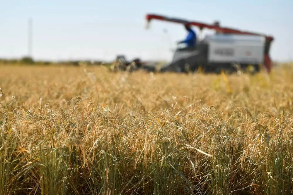 在吉林省白城市大安市海坨乡盐碱地生态修复治理示范基地,农民驾驶收割机收割水稻。(图源:新华社)