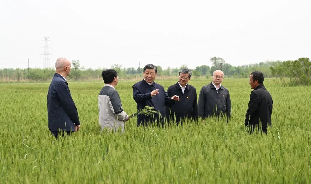 2023年5月11日至12日,习近平在河北考察,并主持召开深入推进京津冀协同发展座谈会。图为11日上午,习近平在沧州市黄骅市旧城镇仙庄片区旱碱地麦田考察时,同种植户、农技专家亲切交流。新华社记者 李学仁 摄