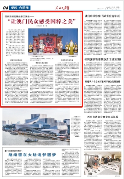 活动期间,国家京剧院在澳门同善堂中学、澳门三育中学开展“京剧进校园”艺术讲座活动,为澳门中学生讲述京剧知识、普及中华优秀传统文化,并在澳门文化中心综合剧院演出《红鬃烈马》《霸王别姬》,让澳门民众感受国粹之美。