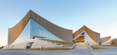 远看,仿佛一条飘带串起戏剧场、歌剧院、音乐厅3个单体建筑;近看,上层为帷幕造型,下层为透明的玻璃建筑,由4134块铝板结构拼接而成的外幕墙,在光影变幻中呈现“大幕拉开”的视觉效果。