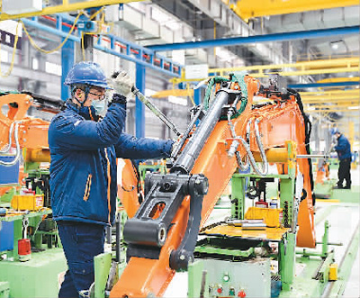 山东省烟台市实施企业倍增计划,推进“9+N”制造业集聚培育工程和16条重点产业链强链、补链和延链,以赋能先进制造业高质量发展。图为位于烟台市的现代迪万伦工程机械有限公司内,工人在流水线上生产挖掘机。新华社记者 郭绪雷摄