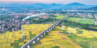 在广东清远,列车从金黄的稻田穿行而过。王美燕摄(人民视觉)