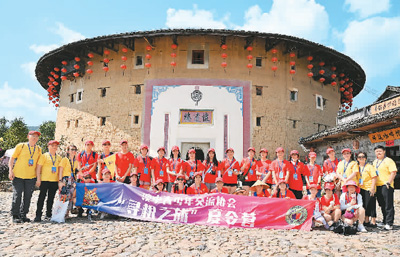 在福建省漳州市,参加“世遗泉州 悦见丰泽”2023年“中国寻根之旅”夏令营的营员在南靖土楼前合影。福建省侨联供图