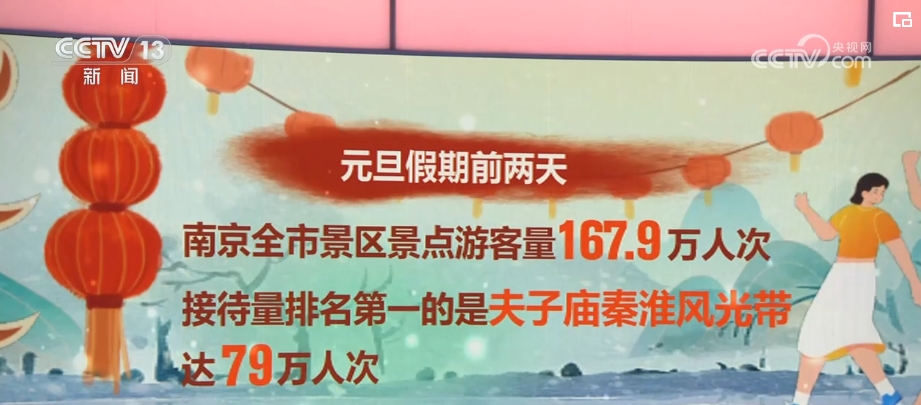 央视网消息:据南京市文旅局数据,元旦假期前两天,南京全市景区景点游客量167.9万人次,接待量排名第一的是夫子庙秦淮风光带,达79万人次。文博场馆游客量达18.2万人次。75家乡村旅游监测点游客量达19.9万人次,比2019年元旦上涨37%。