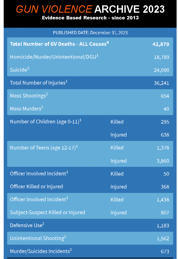 根据该国知名枪支暴力统计网站“枪支暴力档案”(Gun Violence Archive)的记载,该国在2023年一共发生了654起大规模枪击案,是有这项纪录以来的史上第二差,仅次于2021年689起。