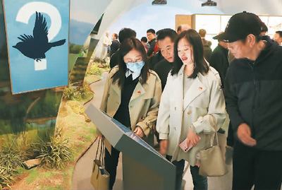 游客在秋口镇石门村的蓝冠噪鹛科普馆体验听声辨鸟。记者 康朴摄