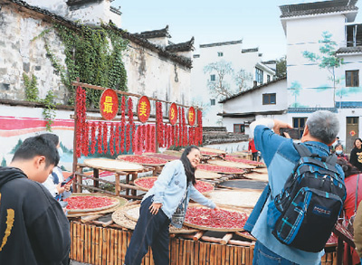 游客在秋口镇石门村晒秋台前拍照。记者 康朴摄
