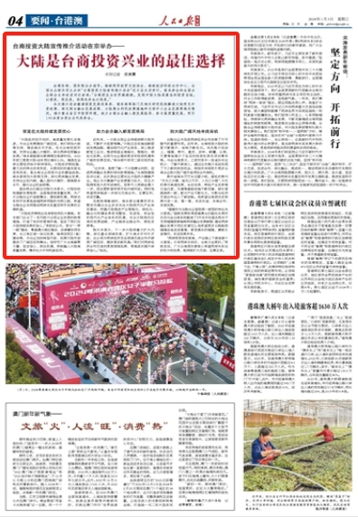 近年来,一大批台资企业持续深耕大陆市场,不断扩大经营规模。“大陆正在实施创新驱动发展战略,建设现代化产业体系,深入推进新型工业化,推进制造业高端化、智能化、绿色化发展。这将为台企提供更多的投资机遇和广阔的发展空间。”商务部外资司二级巡视员赵阳说。