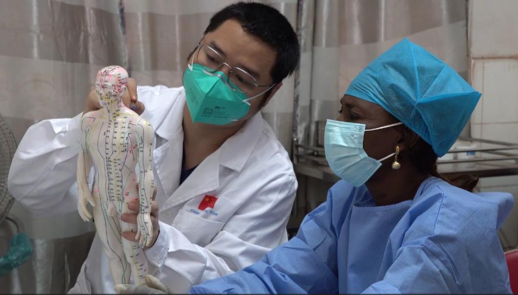 嘉兴市中医医院郝亚波给当地助手讲解中医经络。新华社发
