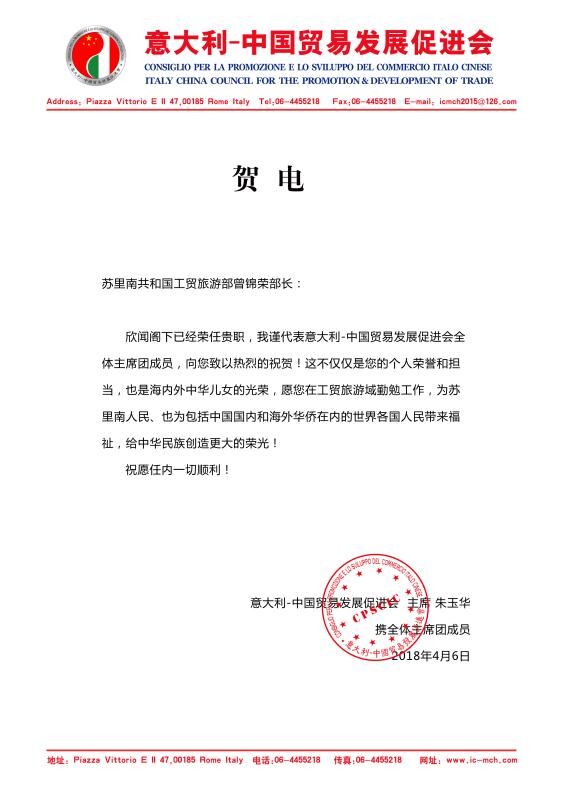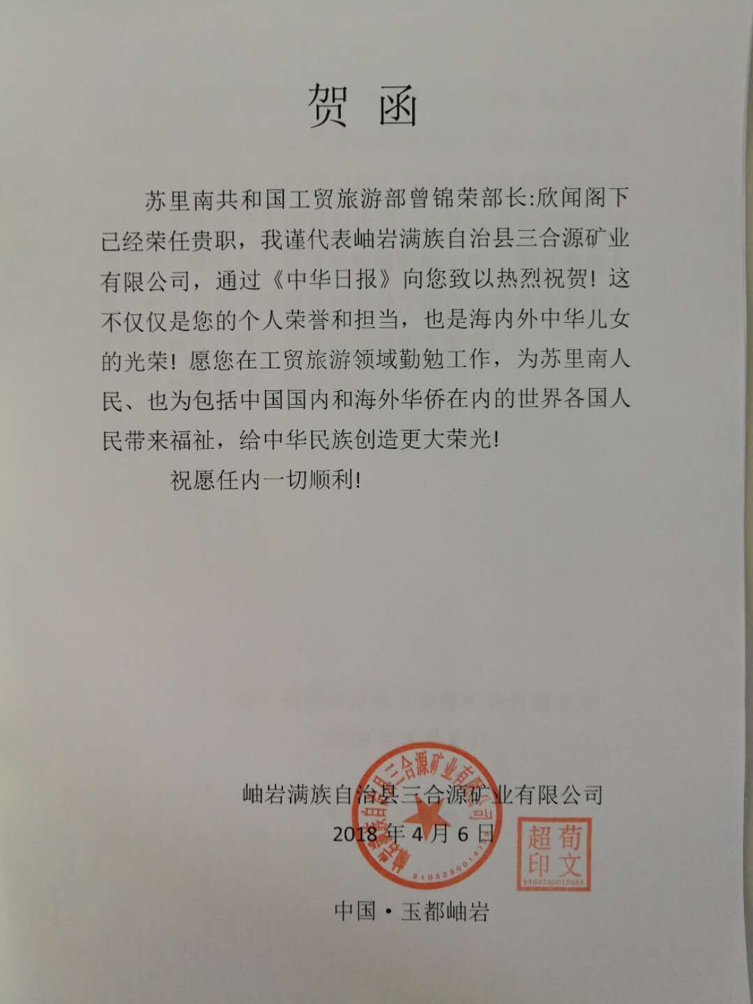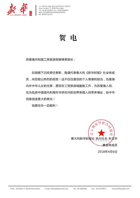 [本报讯]自从4月4日曾锦荣上任苏里南贸工旅游部部长以来,一批外国人士通过浏览苏里南《中华日报》得知信息后,分别通过《中华日报》向曾锦荣部长致以热烈祝贺。