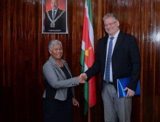 [GFC新闻网讯]欧盟大使Jernej Videtic和负责政治、新闻和信息事务参赞Philippe Coessens访问教育/科学和文化部长Lilian Ferrier。这次的访问是欧盟代表团来苏里南其中一个工作部分。工作访问期间双方进行交流,以促进合作和相互理解,共同致力于改善教育。