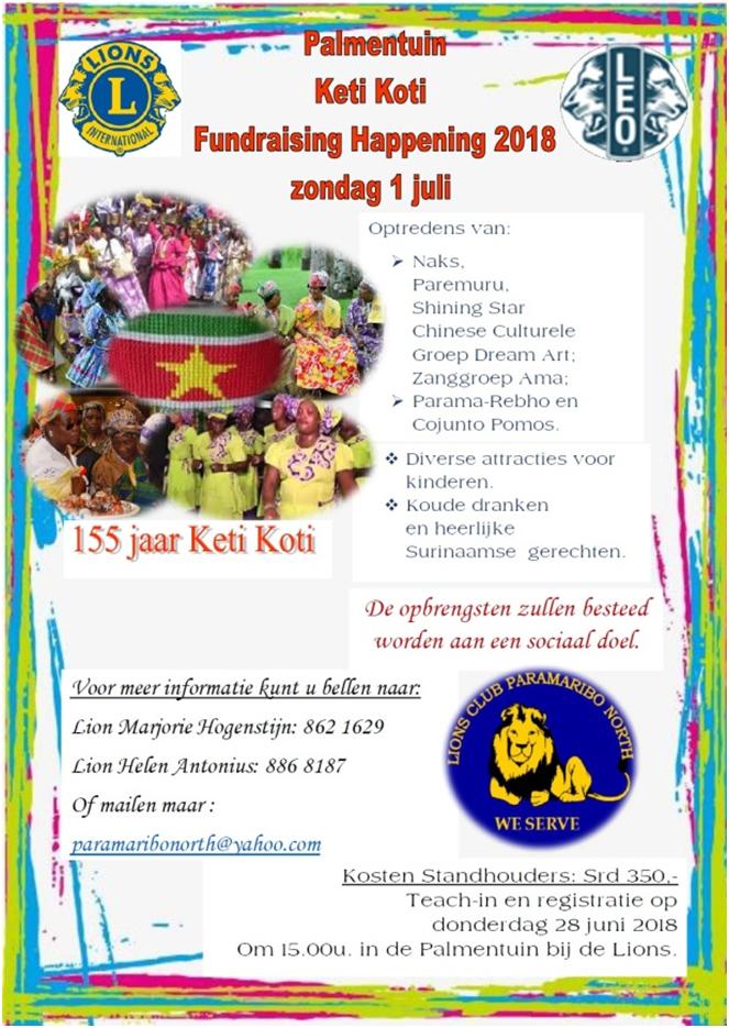 当天在椰林公园会有各种民族的表演包括Naks,Paremuru,Shining Star。很荣幸我们中华会馆狮子队和中华梦想艺术学校都被邀请演出。演出时间为下午12点开始至晚上10点。给儿童也安排各种游戏玩乐,还有各种苏里南美食。狮子会安排摊位出租,价格为350苏元,报名日期6月28日下午3点在椰林公园,联络人士Lion Marjorie Hogenstijn 8621629, Lion Helen Antonius 8868187。活动收到的筹款将作为慈善用途。