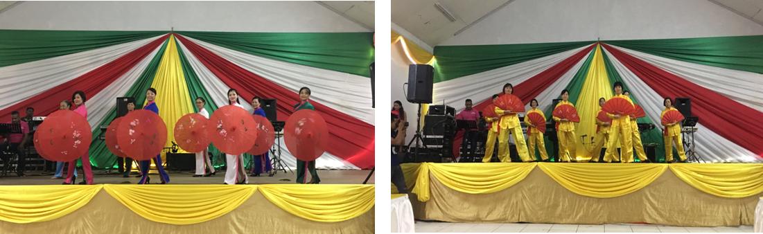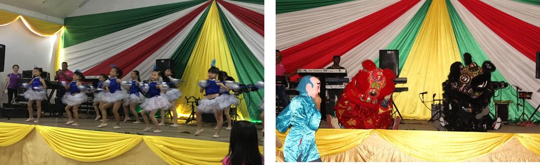 文化节活动于当天下午三点开始,有马拉人传统表演、黑人特色表演和印度舞蹈。中国人节目由中华会馆狮子队为活动拉开序幕,随着震撼人心的锣鼓声狮子队威武出场,黑红两头色彩鲜艳的大狮子时而跳跃时而翻滚,马步扎得极稳,表演幽默诙谐和四个手执葵扇的“大头佛”配合默契,把醒狮表演得惟妙惟肖,看得大家意犹未尽。中华梦想艺术学校的儿童现代爵士舞《大眼睛》活泼可爱,训练有素的孩子们在动感的音乐中起舞,整齐的队形,划一的动作,如花的笑颜收获了大家赞许的目光。梦想艺术学校表演队的旗袍舞蹈《江南情歌》风含情水含笑,音乐响起演员们便犹如温婉的江南女子向大家用轻柔舞步讲述江南烟雨故事,极具中国代表性的旗袍和大红油纸伞深深吸引了观众的目光。华人妇女会表演的太极功夫扇,轻灵沉着,刚柔相济,迈步如猫行,运劲如抽丝。大家的表演都极具中国特色,获得观众如潮般的掌声。和其他民族演员同台演出,台上台下都进行了深入的文化交流。