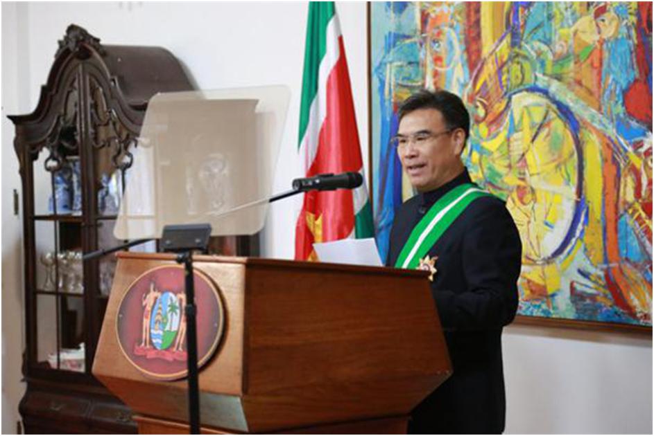 光阴似箭。我在苏度过了美好而又充满意义的两年多时间,如果没有鲍特瑟总统、苏政府、人民和在座各位的支持,我不可能完成我的使命。苏里南给我留下的美好记忆和与诸位的友谊将永远伴随我。
