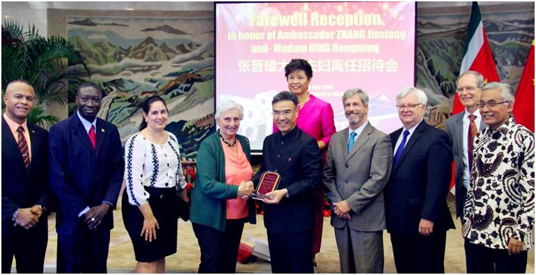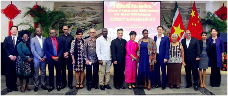 [中国大使馆讯]2018年7月9日,张晋雄大使夫妇在使馆举行离任招待会。苏外交部长、司法警察部长、贸易工业和旅游部长、教育科技和文化部长、劳工部长、体育和青年部长、卫生部长等多位内阁部长、政府官员、国会议员、各国驻苏使节、在苏中资机构和华侨华人代表、主流媒体代表等约200人出席。
