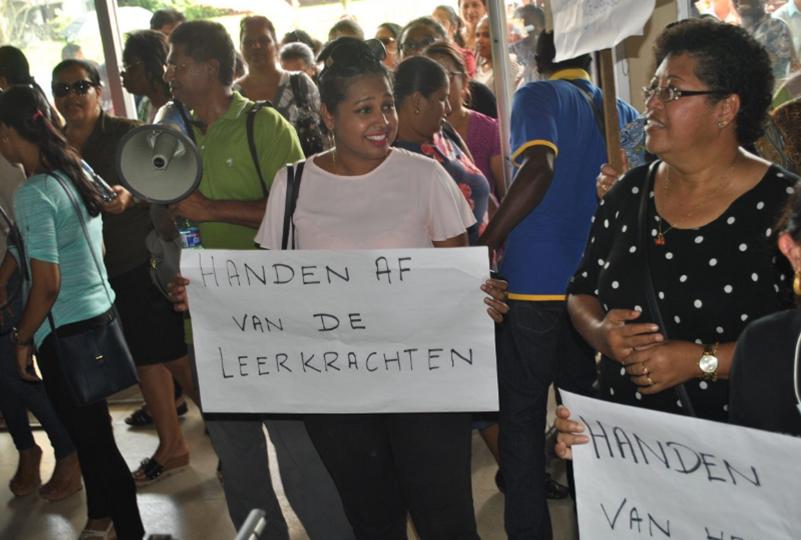 [先锋网讯]如果教育,科学和文化部长Lilian Ferrier继续无视由教师协会(BvL)和教师联盟(ALS)所递交的信件,那么在一周时间之后,教师组织将会再一次组织教师们发起全国性罢工。近日已经有数百名教师前往位于Kafiludistraat的教育,科学和文化部门前进行抗议。