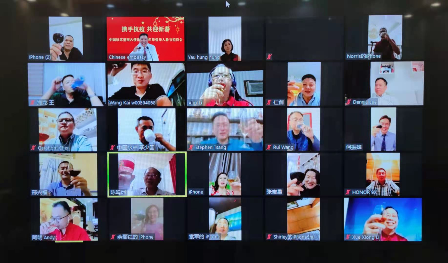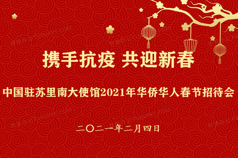 2021年2月4日,驻苏里南使馆举办2021年华侨华人线上春节招待会,庆祝辛丑牛年新春佳节。刘全大使出席并致辞,王传瑞国会议员、曾锦荣国会议员、苏里南华侨华人社团联合总会会长何振雄、各侨团代表、中资企业及汉语教师代表等出席。使馆政务参赞任红岩主持招待会。