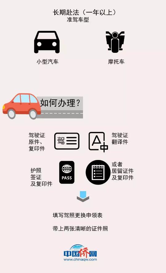需携带中国驾照原件、翻译件和公证文件,有效期1年。