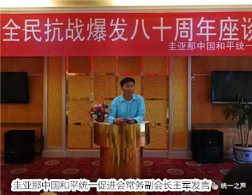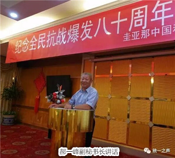 郝一峰副秘书长说,今年是全民族抗战爆发80周年,是中国历史上值得纪念的丰碑,在抗日战争中,包括海外侨胞在内的全体中华儿女,反抗日本侵略,为维护祖国统一和领土完整作出了巨大贡献,谱写了壮丽诗篇。他肯定了圭亚那统促会在海外反“独”运动中做出的成绩。他指出中华民族的独立与统一是全体中华儿女义不容辞的责任,在当前两岸关系日渐复杂的形势下,希望大家团结一致,发扬抗战精神,为促进祖国的统一作出新的贡献。