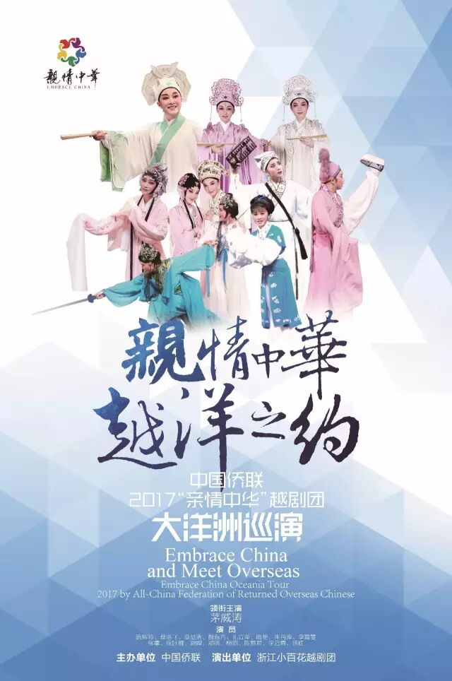今年7月23日至8月10日,中国侨联2017“亲情中华”越剧团大洋洲巡演将持续展开,据了解,本次巡演由中国侨联文化交流部部长刘奇担任团长,亲自带领中国著名专业女子越剧表演团体——浙江小百花越剧团赴澳大利亚、新西兰、汤加、珀斯、悉尼、堪培拉、墨尔本、奥克兰、惠灵顿、努库阿洛法等地演出。