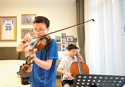 在西南交通大学的家庭探访活动中,四川省都江堰市万汇学校的2名学生在练琴。